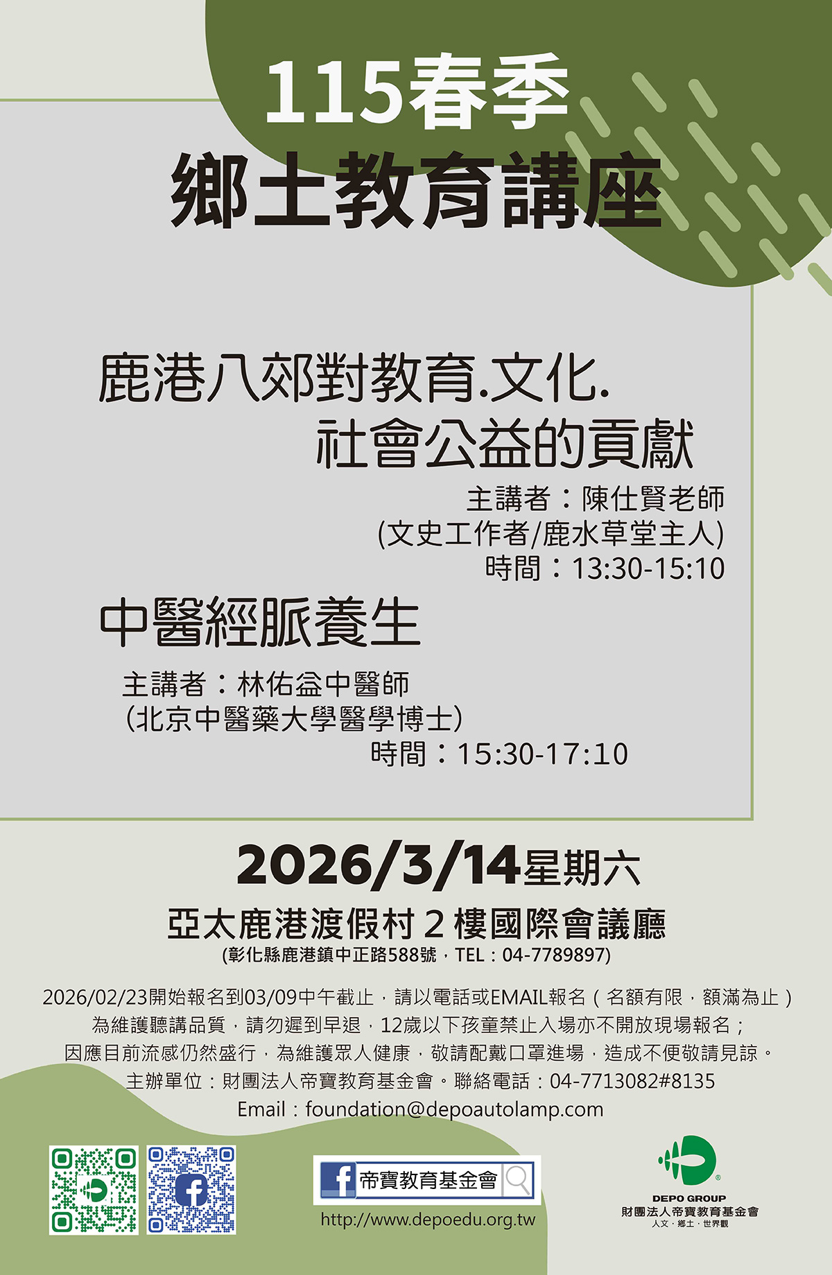 115年春季鄉土教育講座 -3/14(六) 鹿港八郊對教育.文化.社會公益的貢獻 / 中醫經脈養生